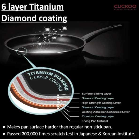 • 6중 티타늄 & 다이아몬드 나노튜브 코팅이 식재료가 들러붙지 않게 하고 오래 사용해도 마모에 강함