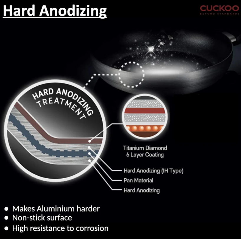재질 하드 아노다이즈드 알루미늄(Aluminium) 바디 + 티타늄 & 다이아몬드 나노튜브 코팅 6중 코팅 (non-stick)